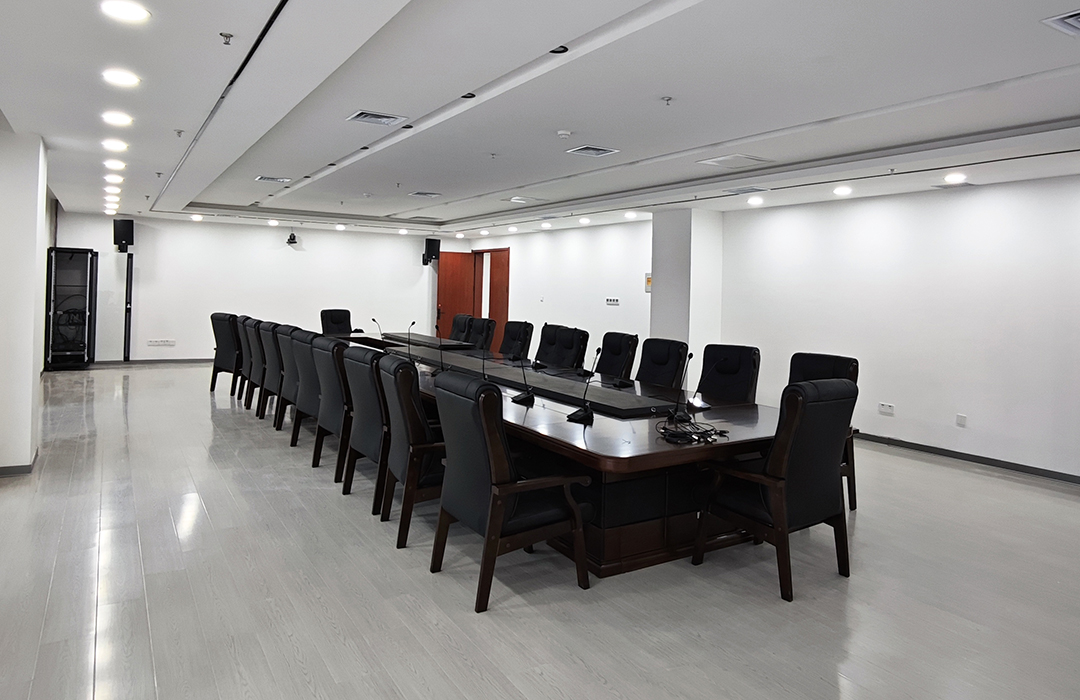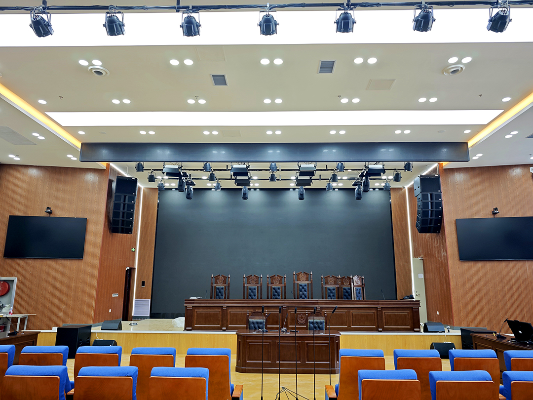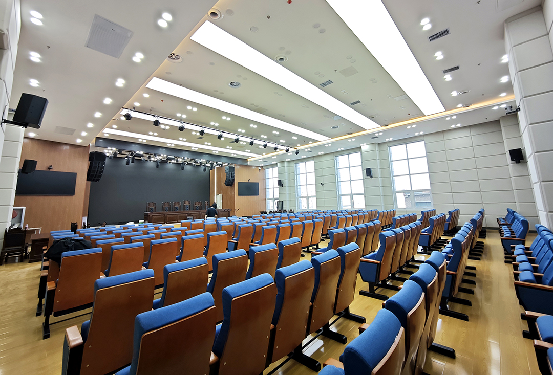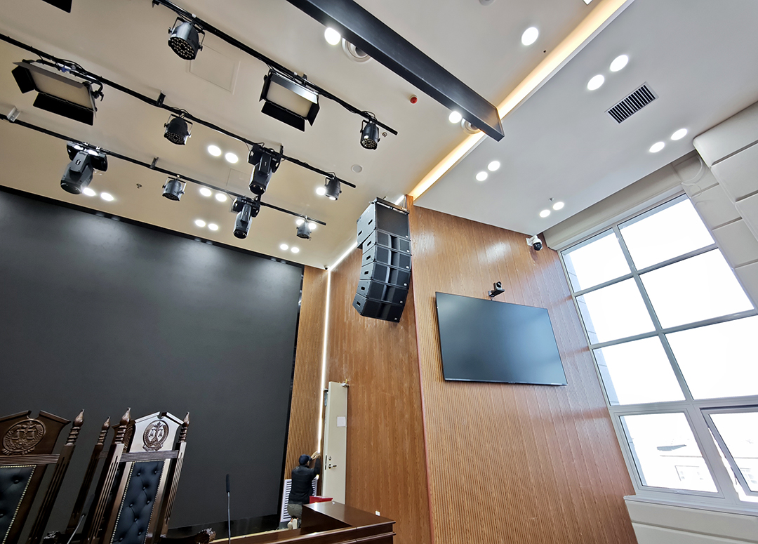 法院还设有2个会议室,主要功能用于日常开会等,设计特性在于确保场馆扩声声场的响度均匀、均衡性好;为此惠声在馆内设计了4只专业全频音箱,有较高的传声增益,音乐重放时要求声音清晰自然,使用专业扩声设备可以确保声音更加清晰响亮。